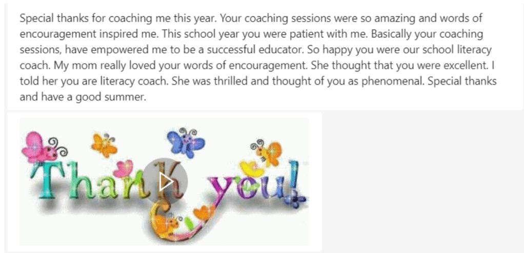 “I love the comment someone left about the affirming environment you set. Making participants feel appreciated and successful helps to build the psychological safety needed for them to lean into the work and try something new! Thanks so much for all you’ve done to support educator this year! It has been a pleasure to have the expertise, joy, approachability you always carry with you as part of your work.”